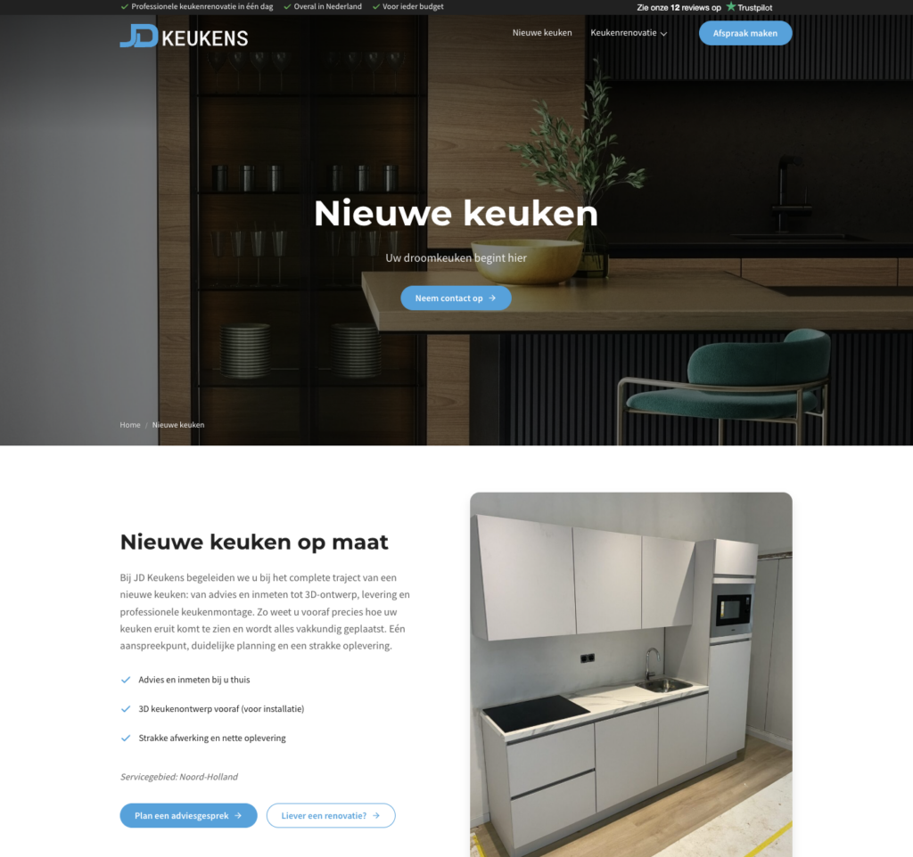 Tot slot hebben we een nieuwe sectie toegevoegd voor nieuwe keukens. Voorheen lag de focus van JD Keukens op renovatie. Met deze uitbreiding kwamen er ineens ook aanvragen binnen voor nieuwe keukens, wat commercieel een groot verschil maakte.